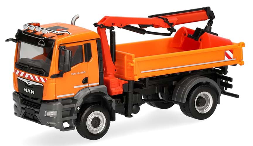 MAN TGS NN 18.480 4x4 Dreiseitenkipper mit Ladekran, orange -- MAN Promotion-Modell --